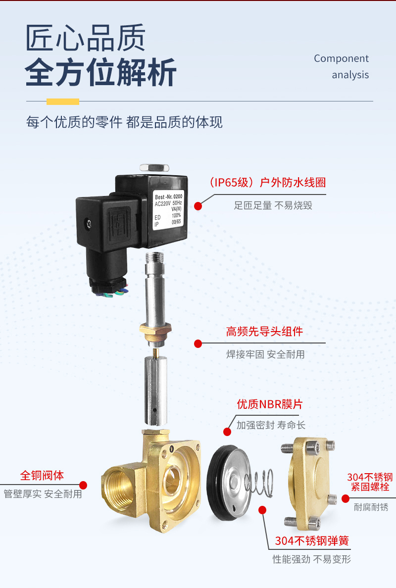 | 阀体材质 | 黄铜 | 压力范围 | 0.2~1.6Mpa | 注意事项 | 1、这款为高压常闭电磁阀,通电打开,断电关闭。这款阀通电后达到2公斤压力才能打开。建议水平安装。 2、建议一次通电1小时内,如需长时间通电请联系加装节能模块 3、这款电磁阀防护等级IP65,可用于户外 |