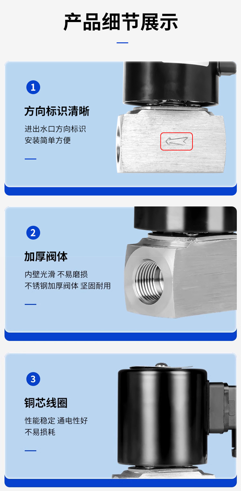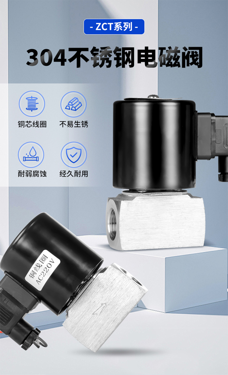 产品名称ZCT电磁阀阀体材质304不锈钢工作形式常闭型(通电打开断电关闭)使用介质水、空气、油、弱酸碱液体工作电压AC220V/DC24V介质温度-5~150℃工作压力0.1~1.0Mpa(1~10kg)动作方式直动式/先导式