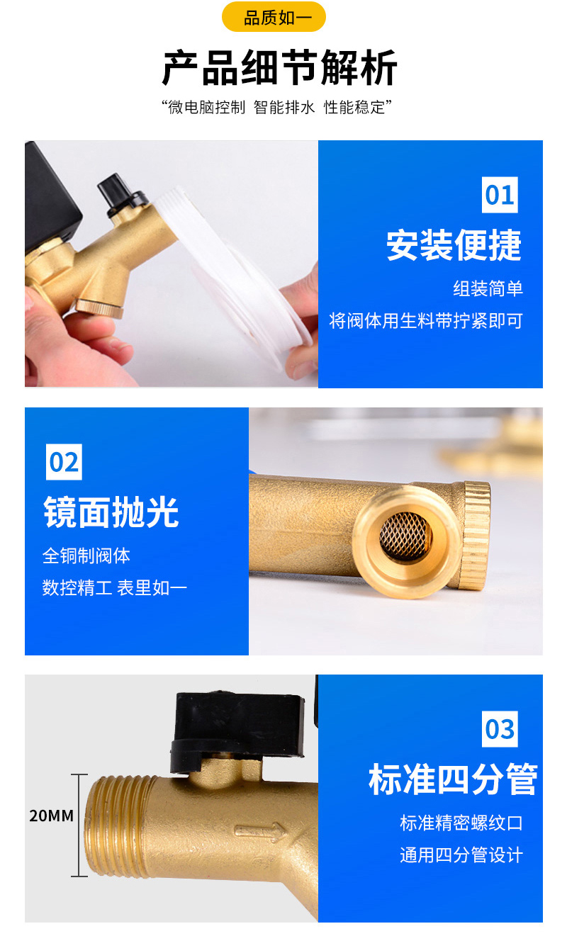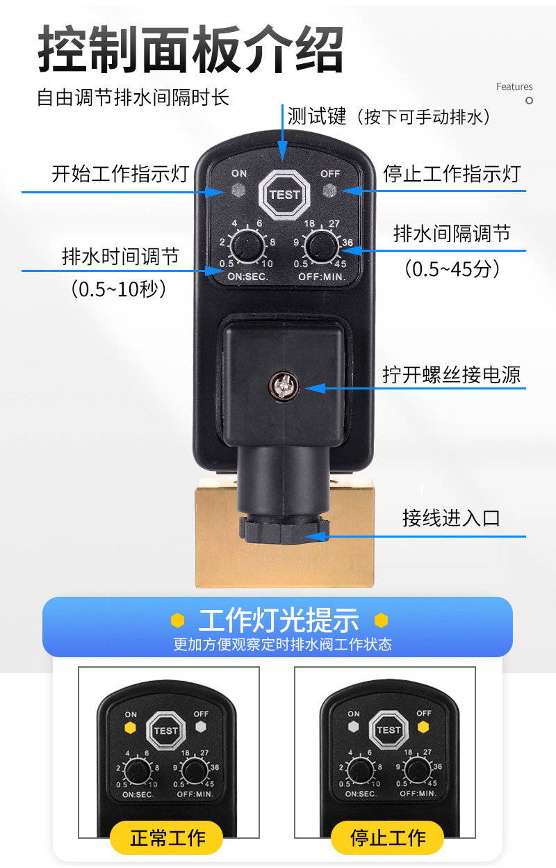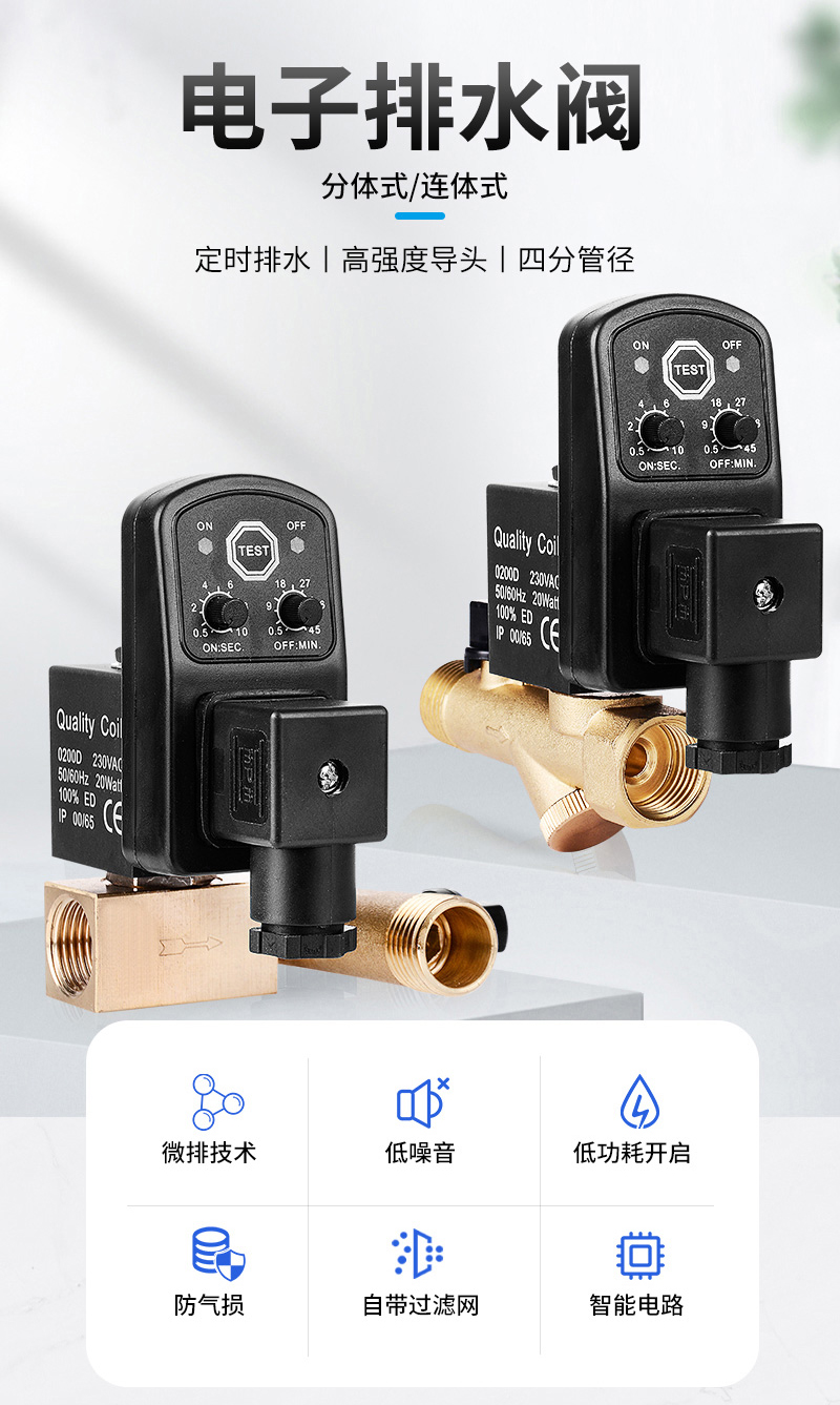 产品型号OPT-A/OPT-AB压力范围0.1~1.6Mpa产品名称四分分体/连体阀流体温度-5~80℃阀体材质纯铜阀体产品注意事项这定时自动排水阀不推荐用于排污水或带较多颗粒物的场合。电磁阀体上有箭头注明水流方向,装反不能工作注意防水和匹配电压工作电压AC220V/DC24V