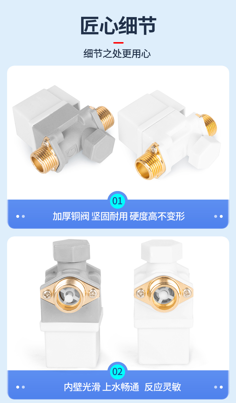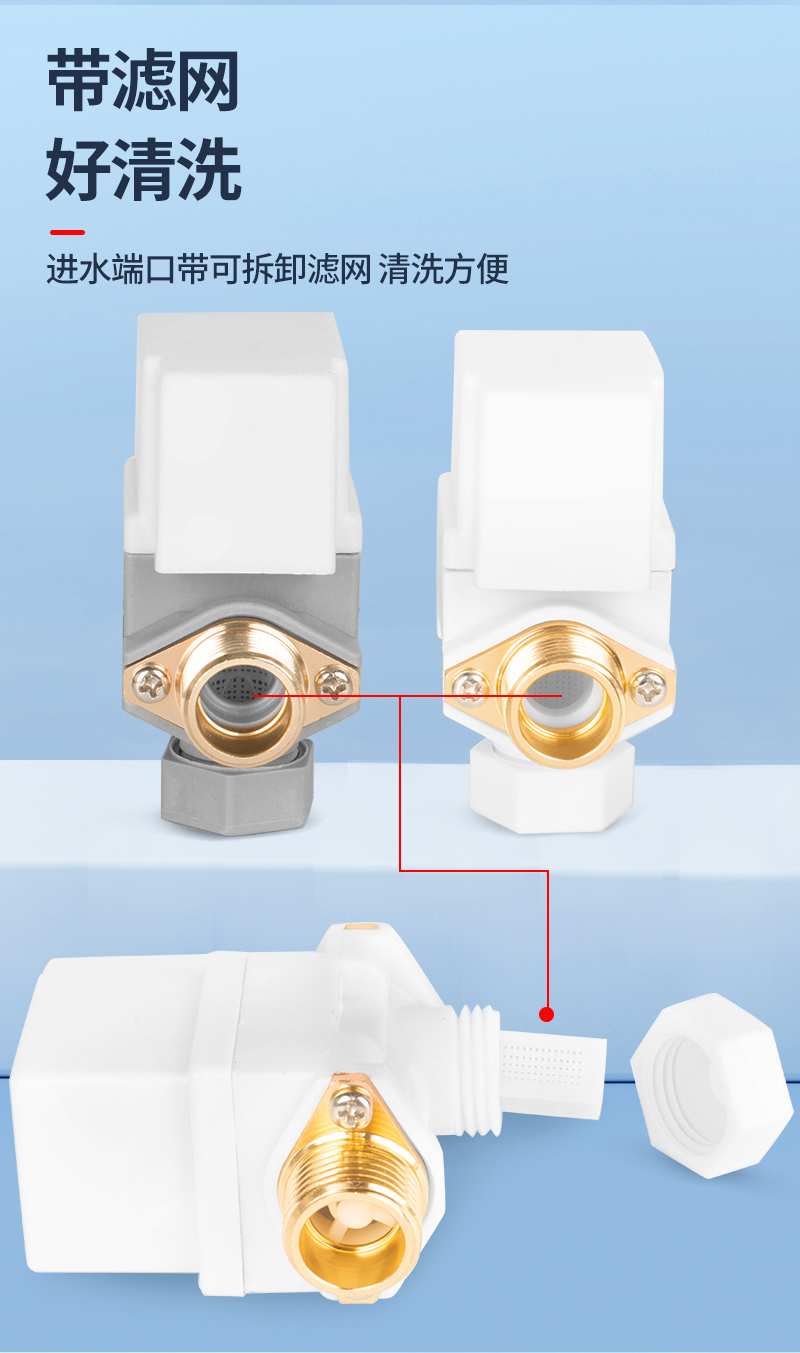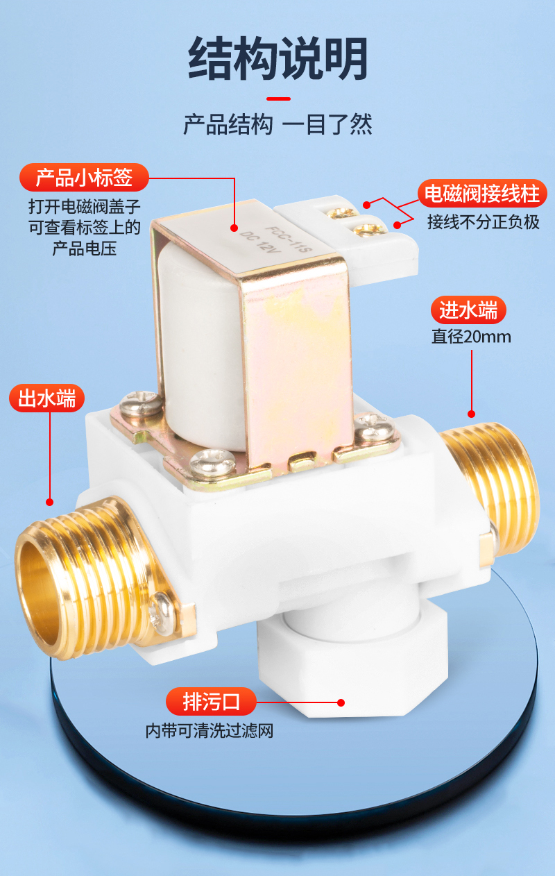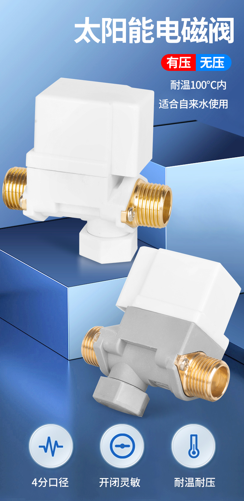 产品名称太阳能电磁阀可选电压DC12V工作形式常闭型(通电打开 断电关闭)耐温范围100℃内工作压力0.02~0.8Mpa(0.2~8kg)过滤功能可拆卸清洗过滤装置电磁阀材质阀体部分为塑料,接头为铜材