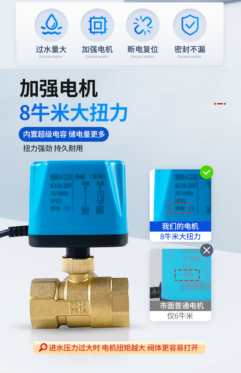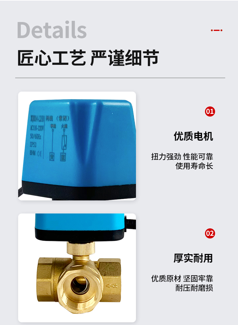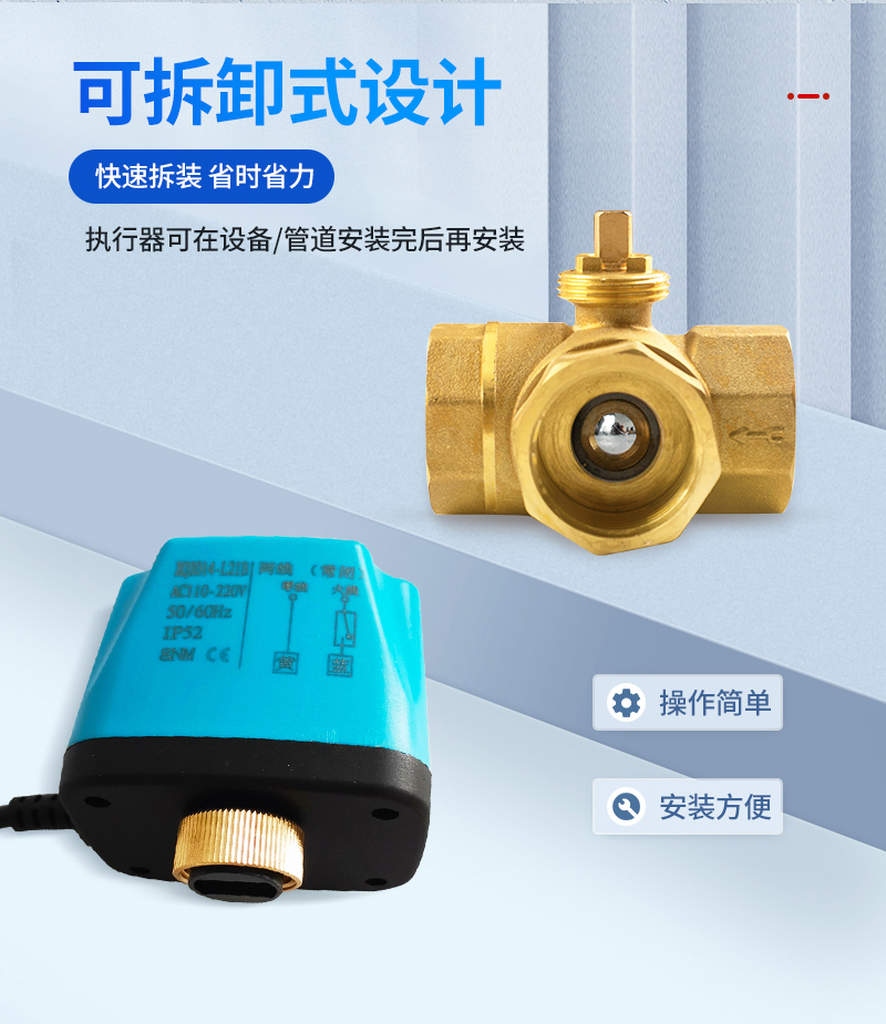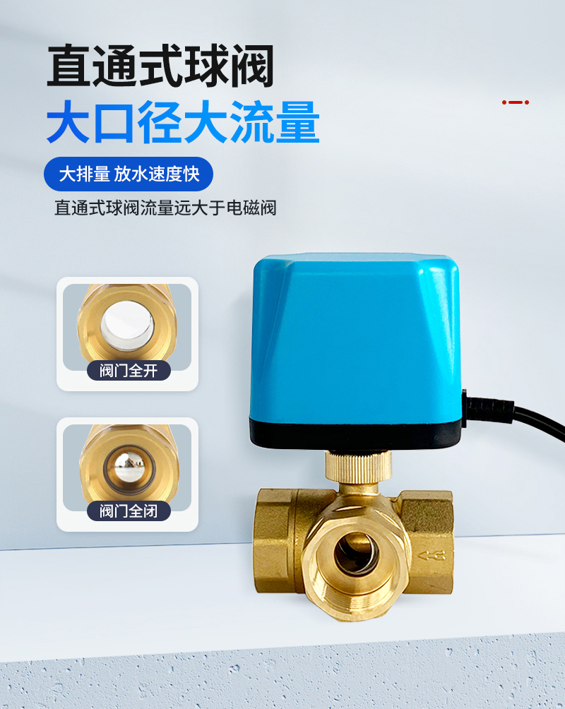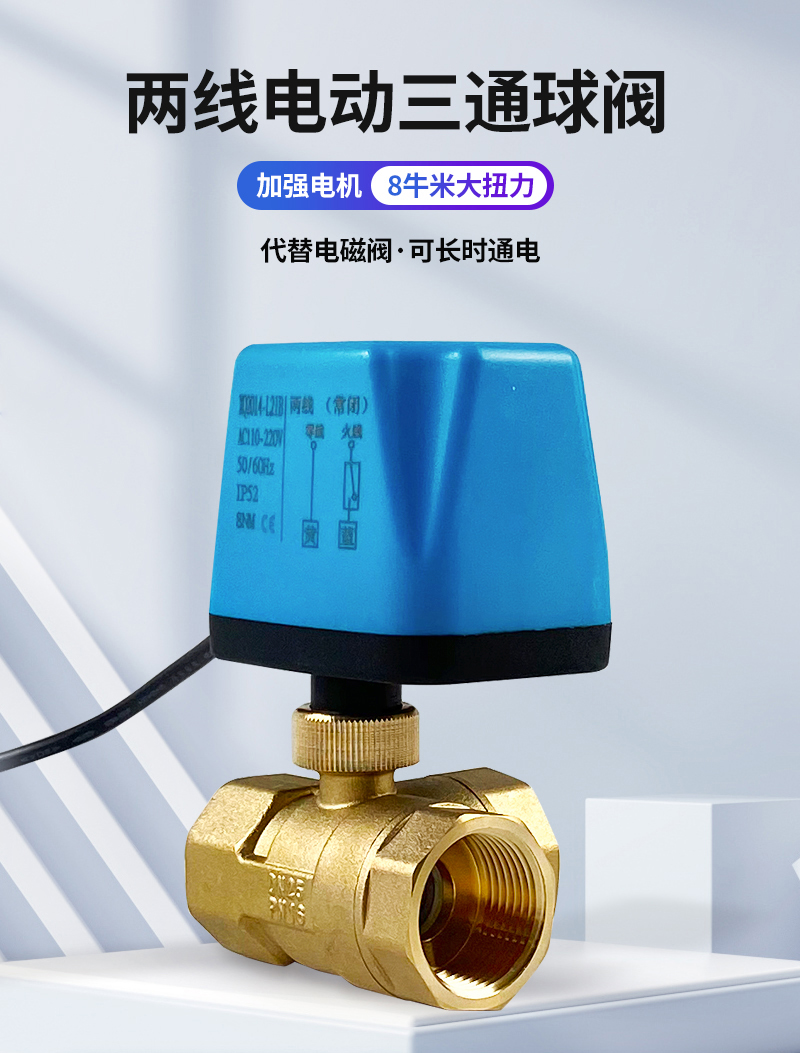 产品名称两线三通电动球阀款式三通驱动电源AC220V/AC110V/AC24V/DC5V/DC12V/DC24V电机类别同步电机阀体材质黄铜允许工作压差≤0.4Mpa阀门承压1.6Mpa介质温度-5~80℃连接方式螺纹