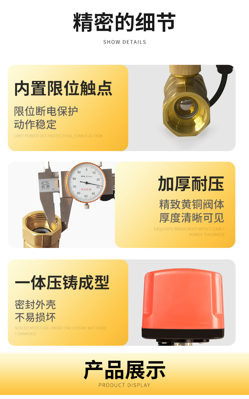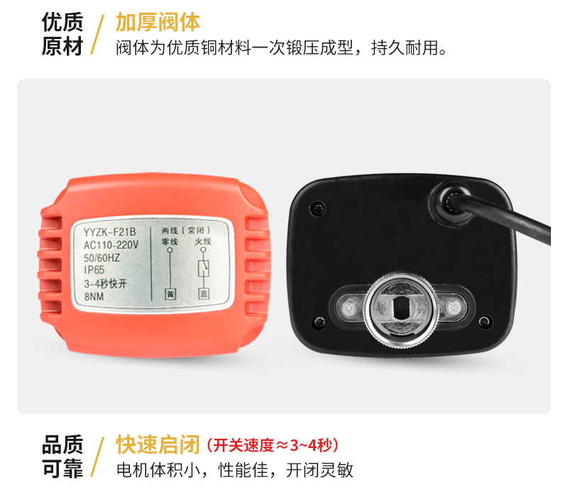 产品名称快速启闭电动球阀阀体耐压1.6Mpa品牌悦尔连接方式管螺纹G扭力8牛米介质温度-5~80℃动作时间3~4秒介质冷/热水