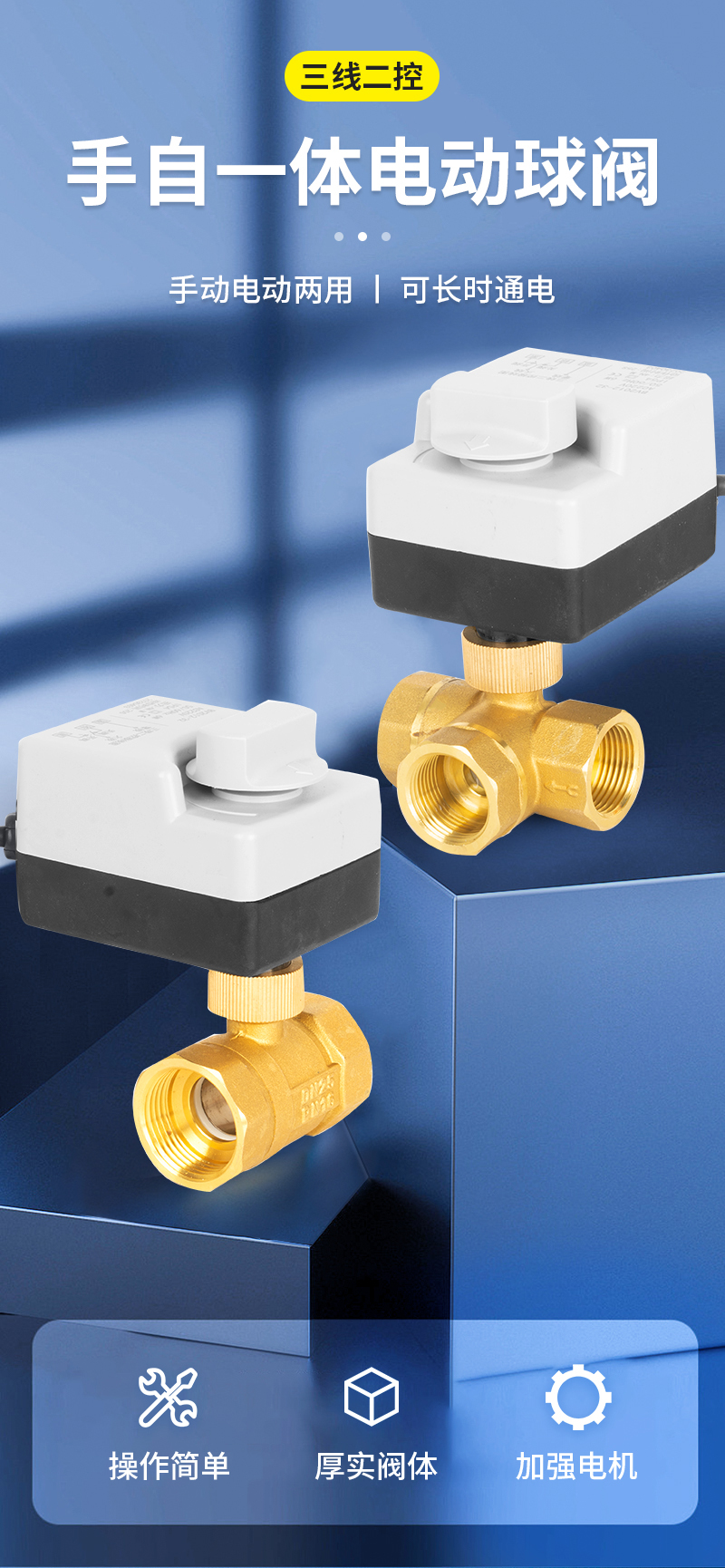 产品名称手自一体电动球阀介质冷/热水连接方式螺纹连接扭矩大小3牛米结构形式直通式质保期限电动球阀整体质保一年,配件三个月压力范围≤0.3Mpa注意事项1、本产品不适合汽车上使用(原因:不防水,不抗震,不防潮、车上电压不稳定)2、本产品不建议安装在户外潮湿环境低于零下最低20℃,水流正常流动情况下可以使用