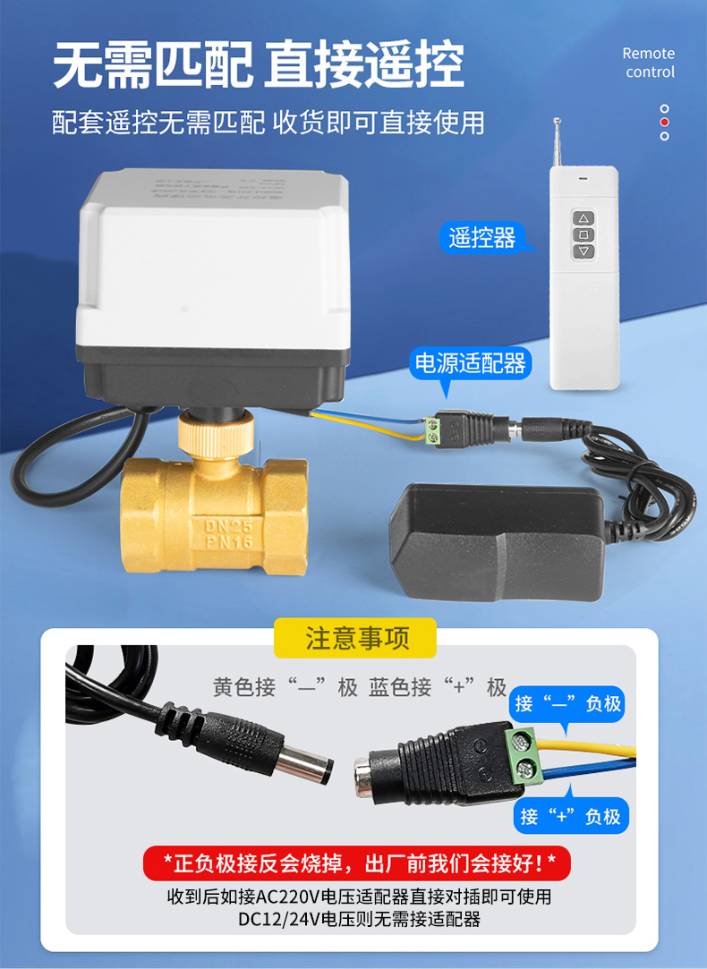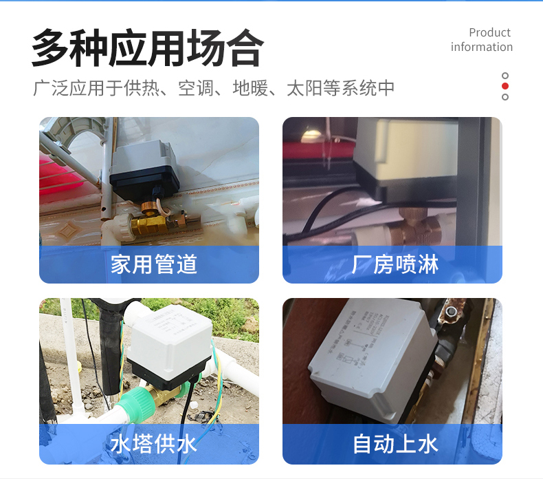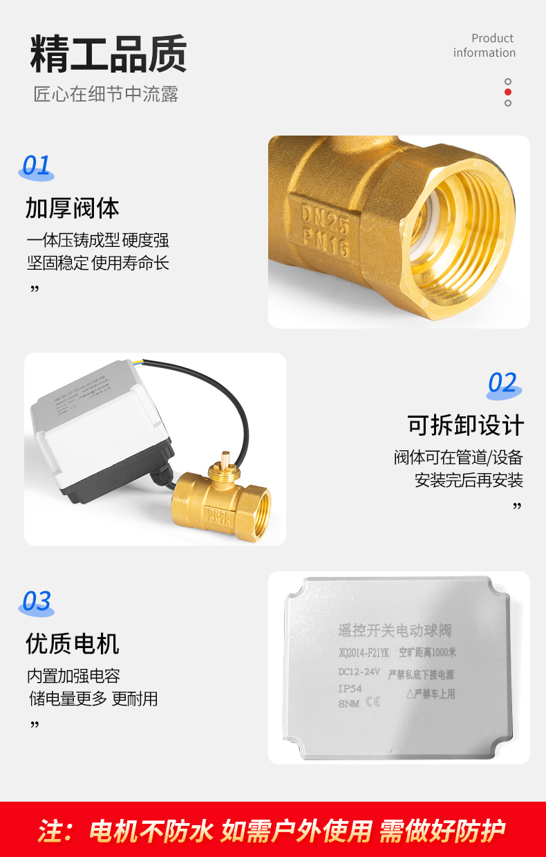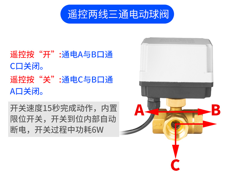产品名称电动球阀介质温度-5℃~80℃阀体材质黄铜/不锈钢连接方式螺纹连接动作时间6~15秒介质冷/热水允许工作压差≤0.4Mpa驱动电源AC220V/AC110V/AC24V/SC8V/DC12V/DC24V