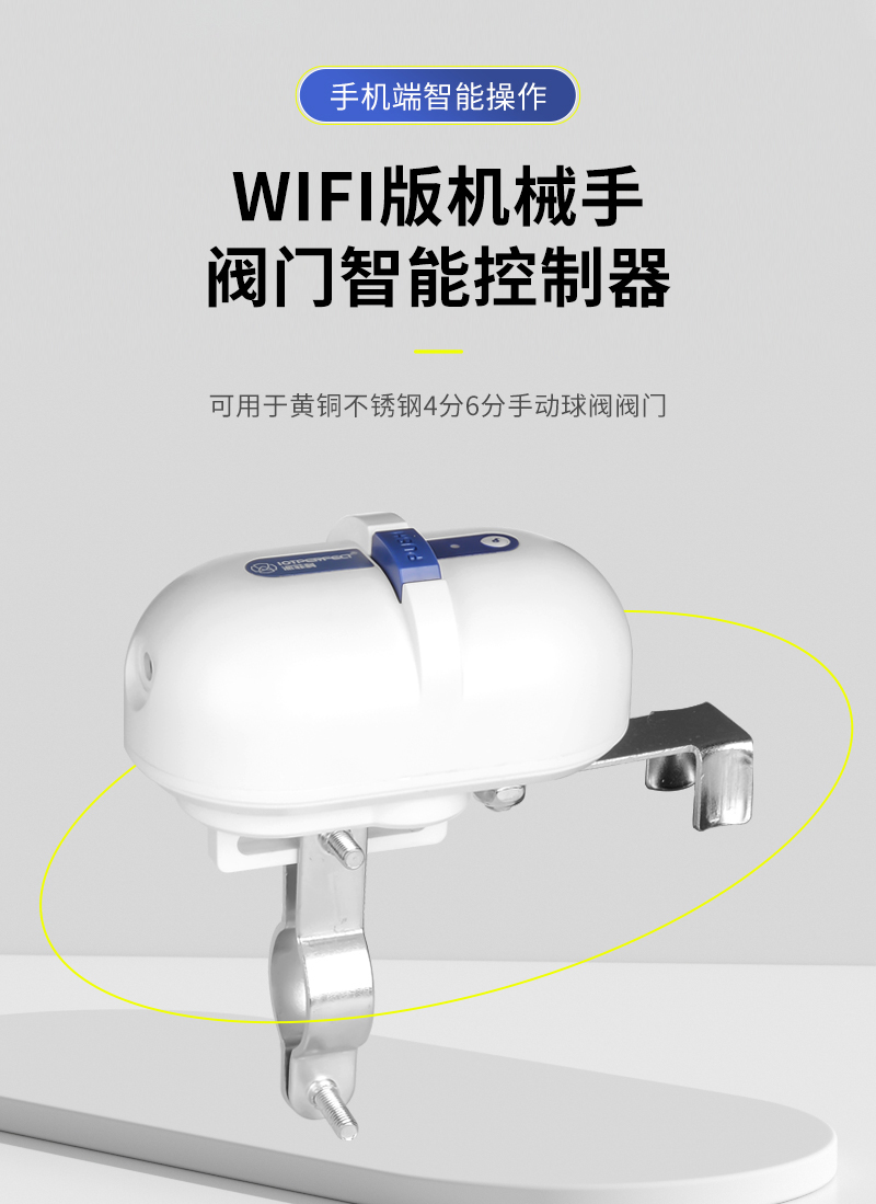 产品名称WIFI无线远程遥控电动阀门机械臂关阀时间5~10s电源电压12V/1A开阀时间5~10s阀门压力1.6Mpa阀门规格4/6分扭矩30~60kg.cm工作温度-10℃~+65℃