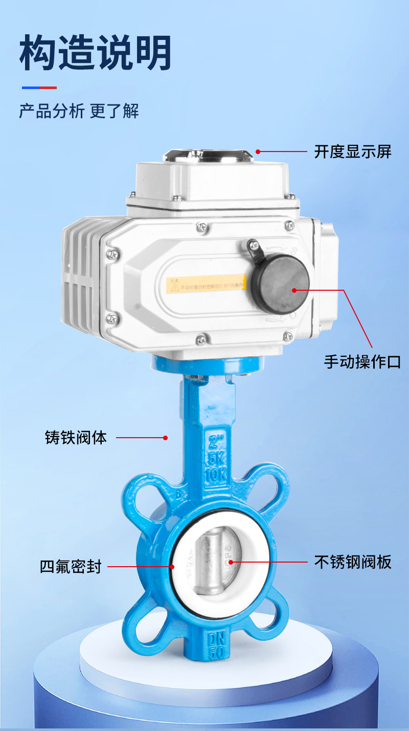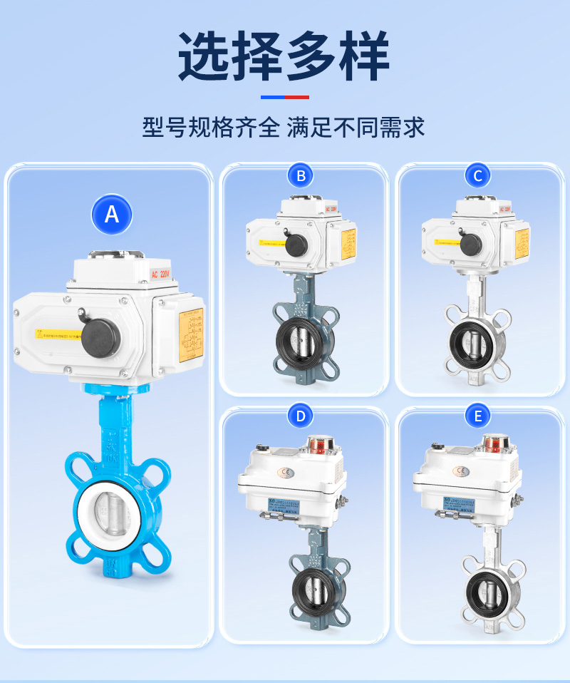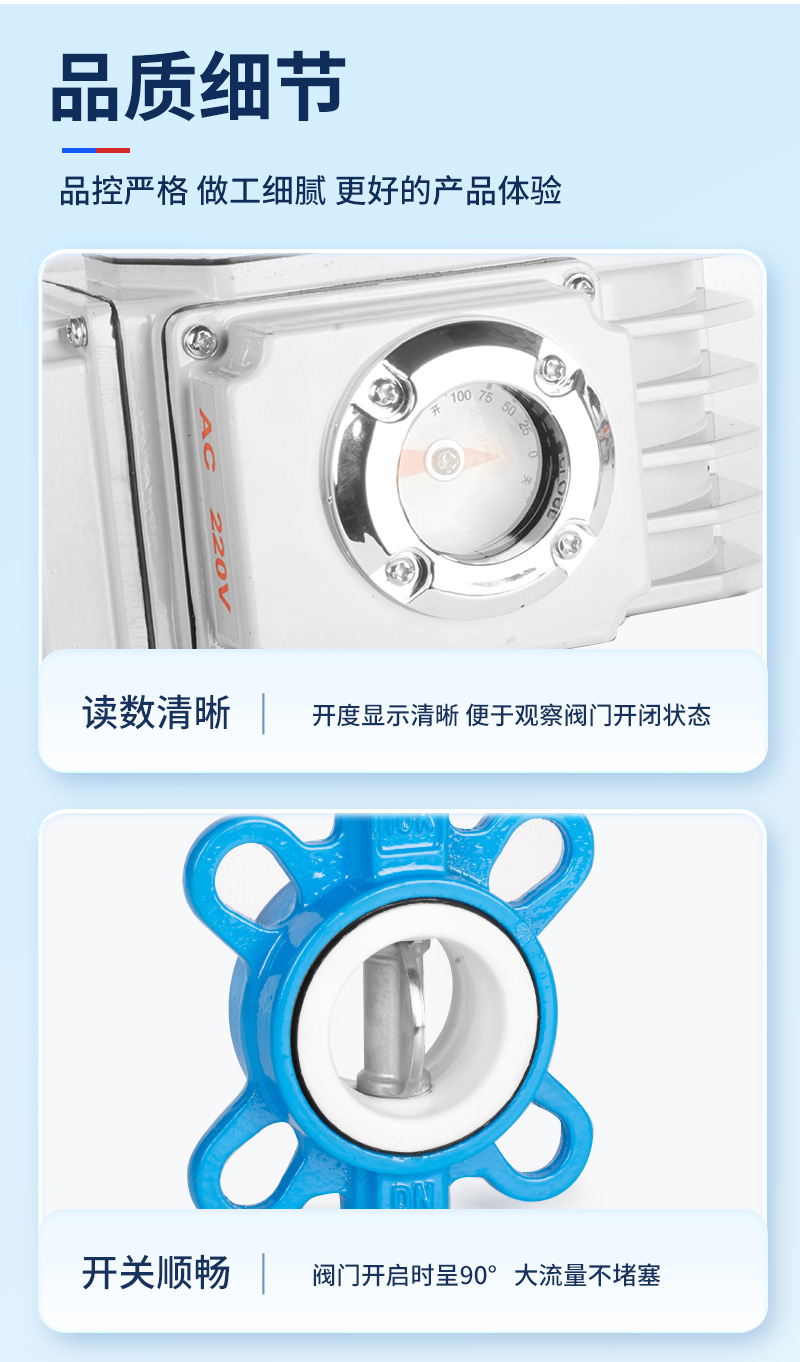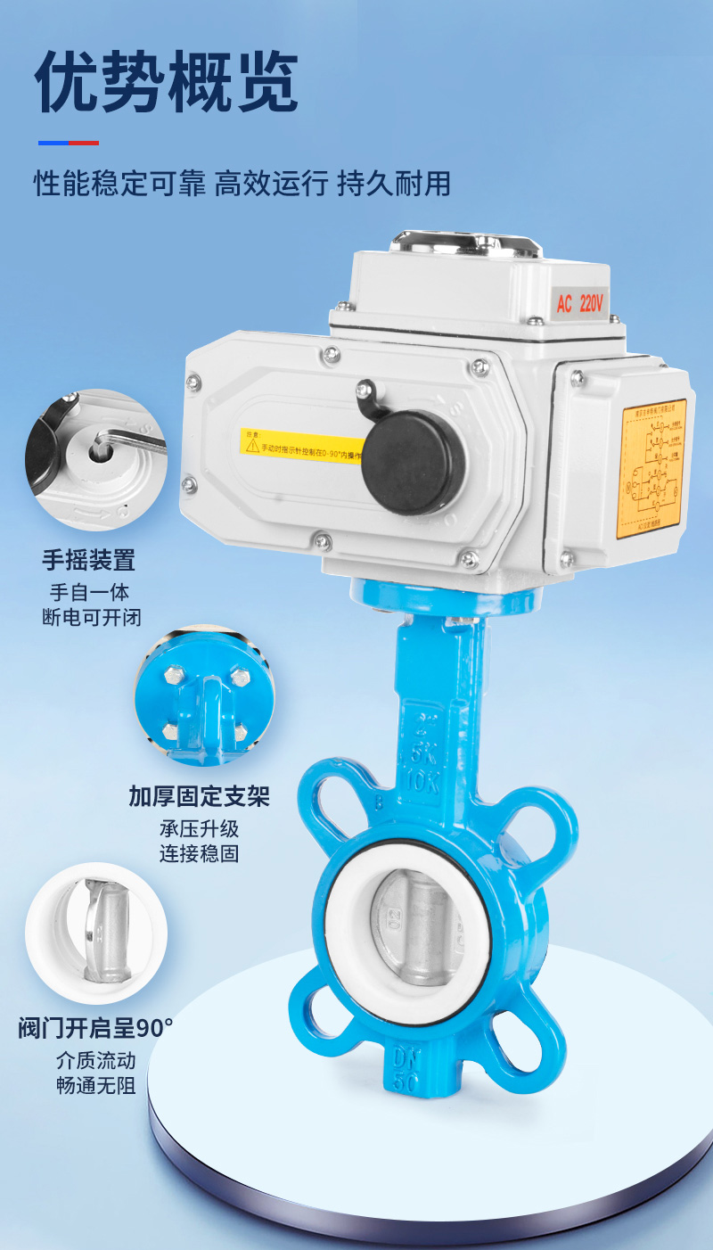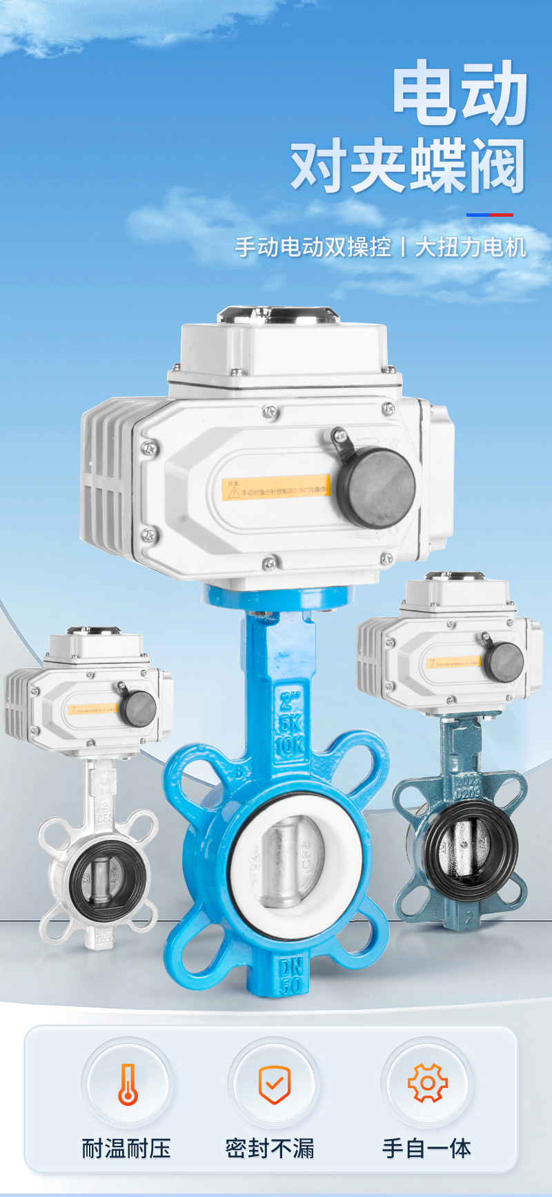 产品名称电动对夹蝶阀密封材质橡胶/四氟乙烯阀体材质铸铁/不锈钢适用介质干净的水/气/油阀板材质304阀板/铸铁阀板适用温度80℃/150℃内耐压范围1.6Mpa动作范围0~90°±5°
