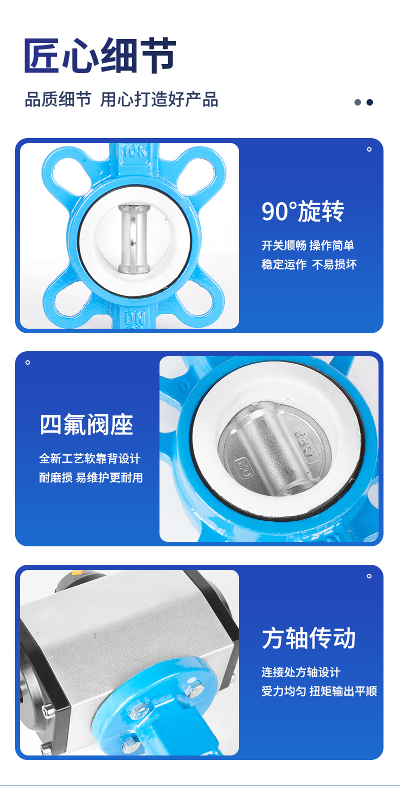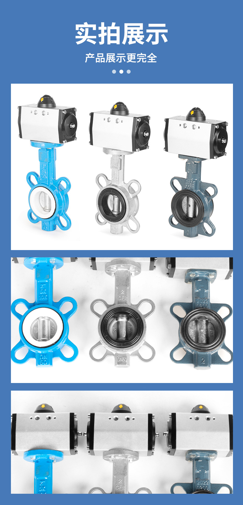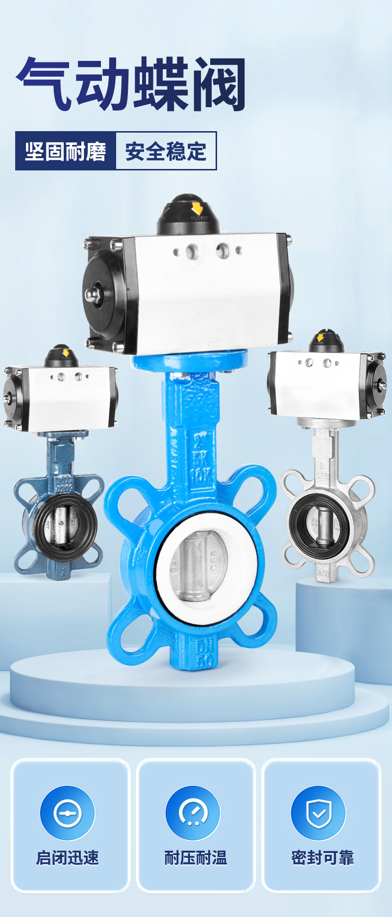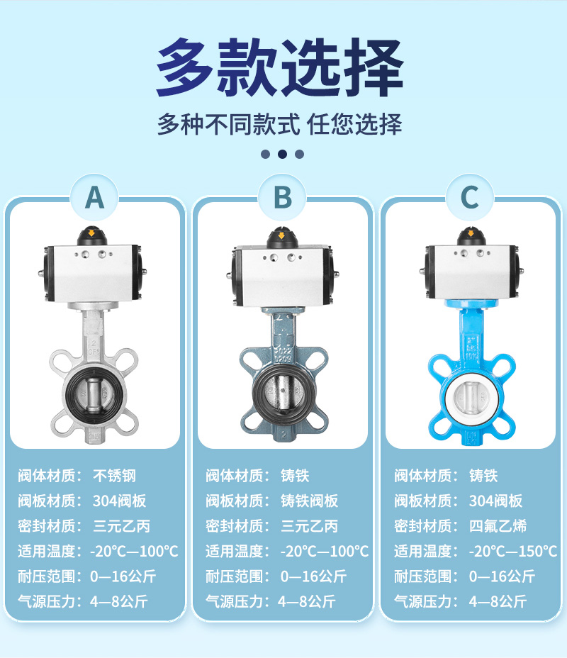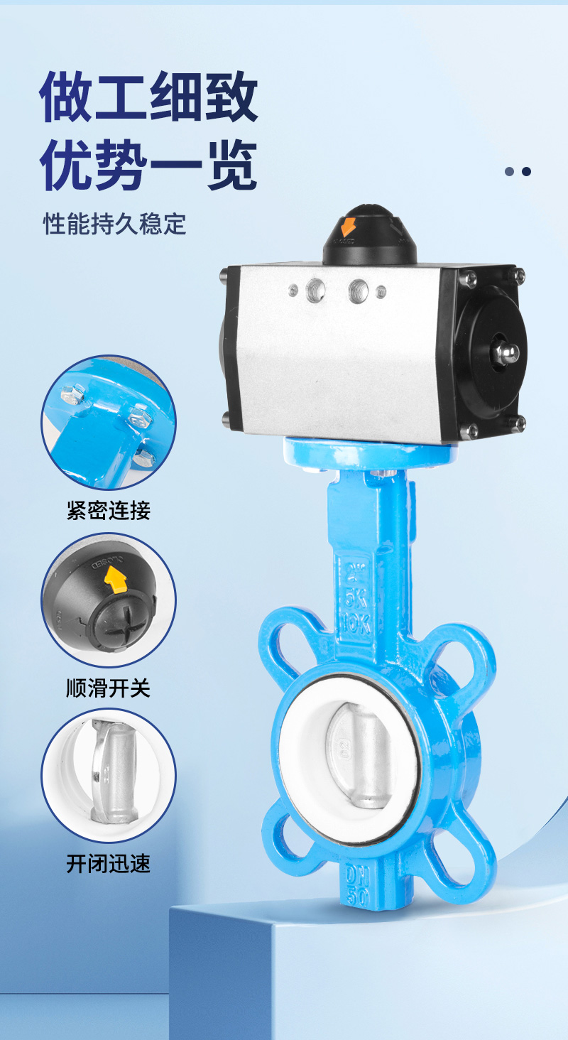 产品名称气动对夹蝶阀耐压范围0~16公斤适用温度-20℃~100℃/150℃气源压力0.4~0.8Mpa阀体材质不锈钢/铸铁适用介质干净的水/气/油阀板材质304阀板/铸铁阀板密封形式四氟乙烯/三元乙丙产品特点1、安装方式无要求,可水平/垂直安装2、流阻系数小,流量特性趋于直线,不会滞留杂物