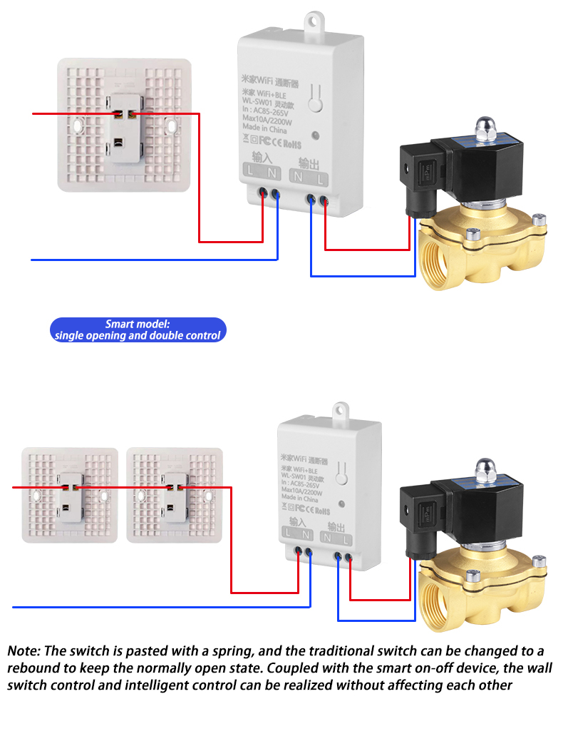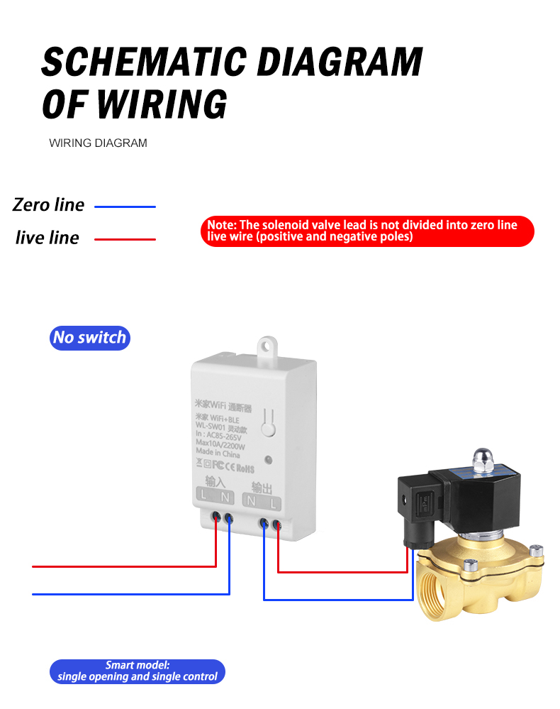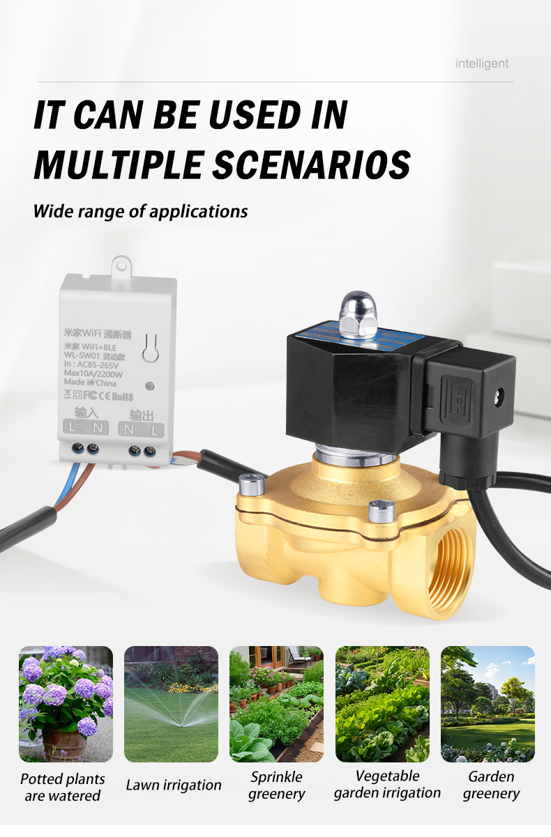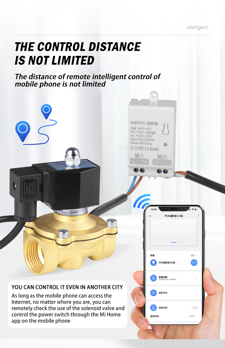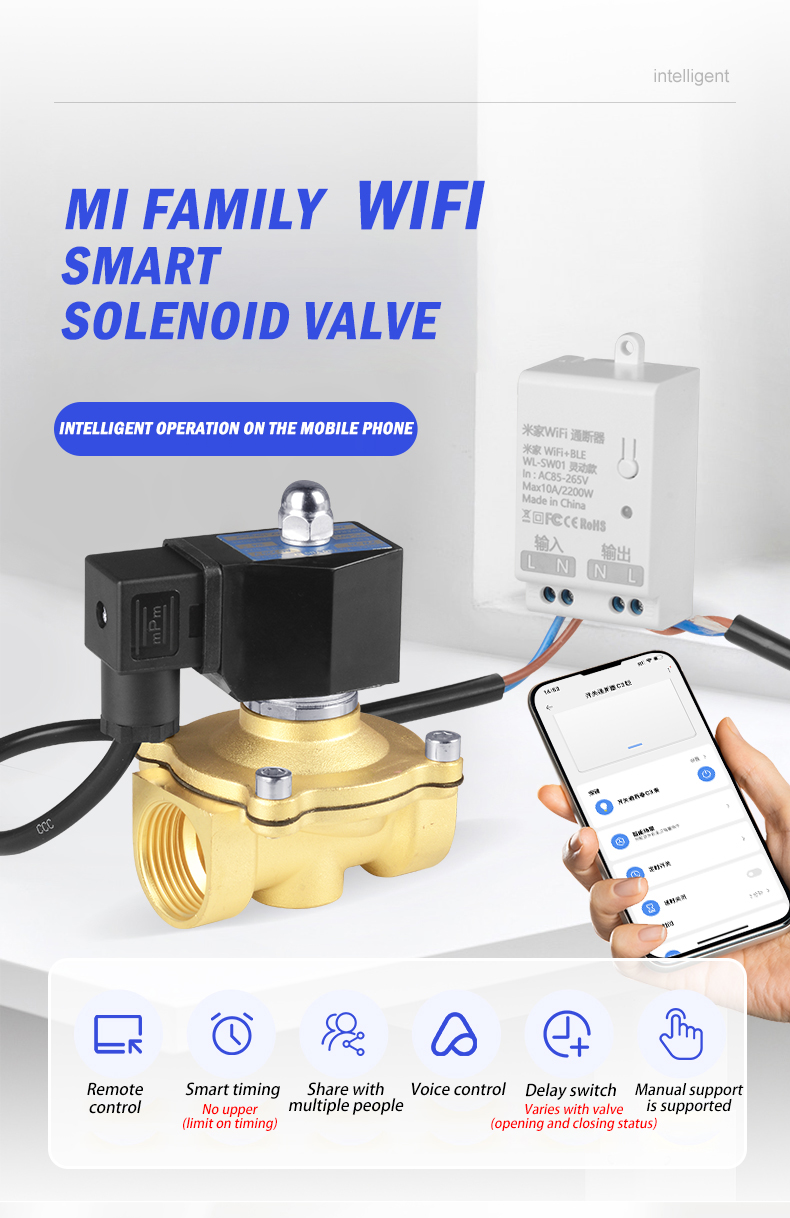 | Product name | WiFi Mi family smart solenoid valve mobile phone remote control normally closed water valve | Operating voltage | AC220V | On-breaker output voltage | AC85-256V 50/60HZ |