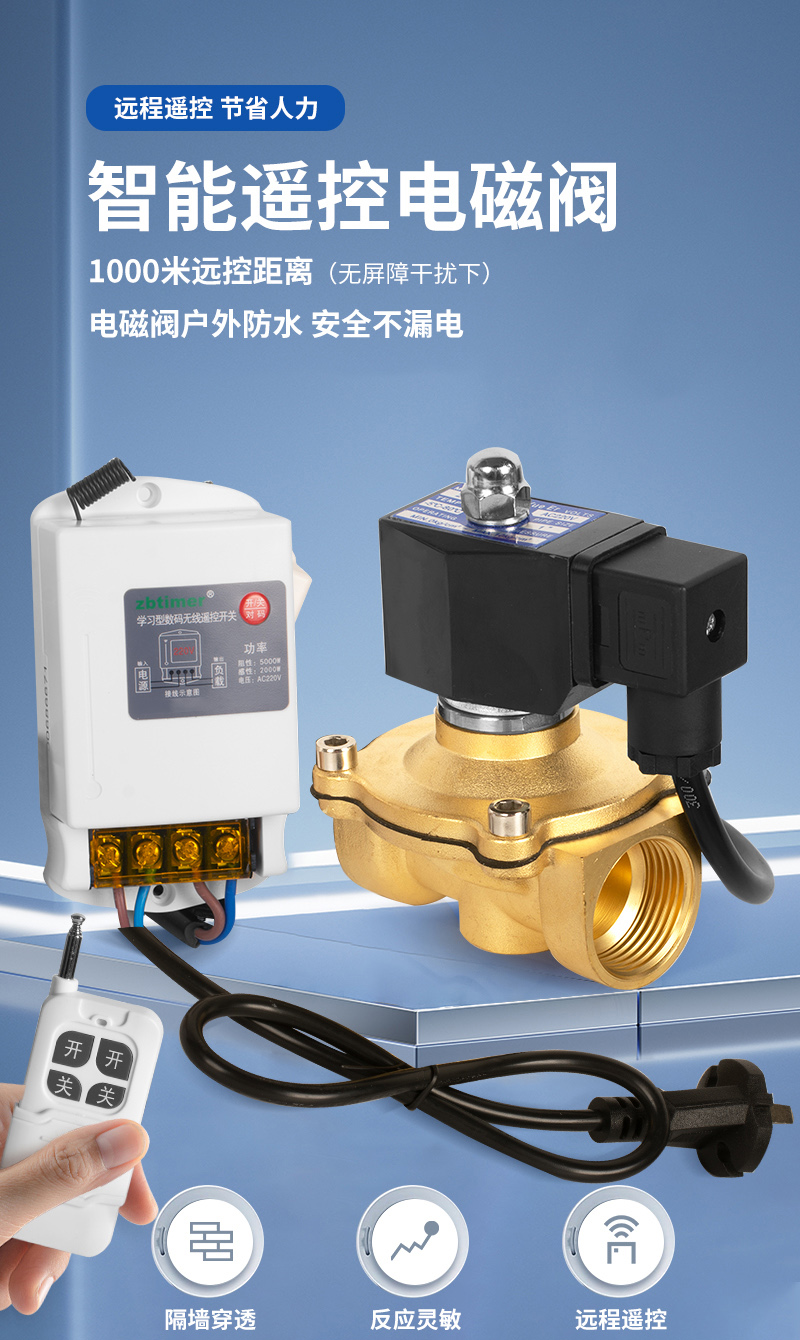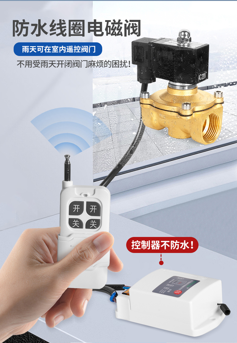 产品名称1000米远程遥控常闭防水电磁阀使用方式直动式质保期限电磁阀阀体质保一年,线圈和膜片质保三个月(非人为损坏)工作电压AC220V温度范围-5℃~80℃阀体材质黄铜/不锈钢压力范围0~1.0Mpa注意事项1、控制器不防水2、电磁阀建议通电1小时内如需长时通电要添加节能模块3、电磁阀线圈须水平安装,垂直安装需联系客服线圈材质