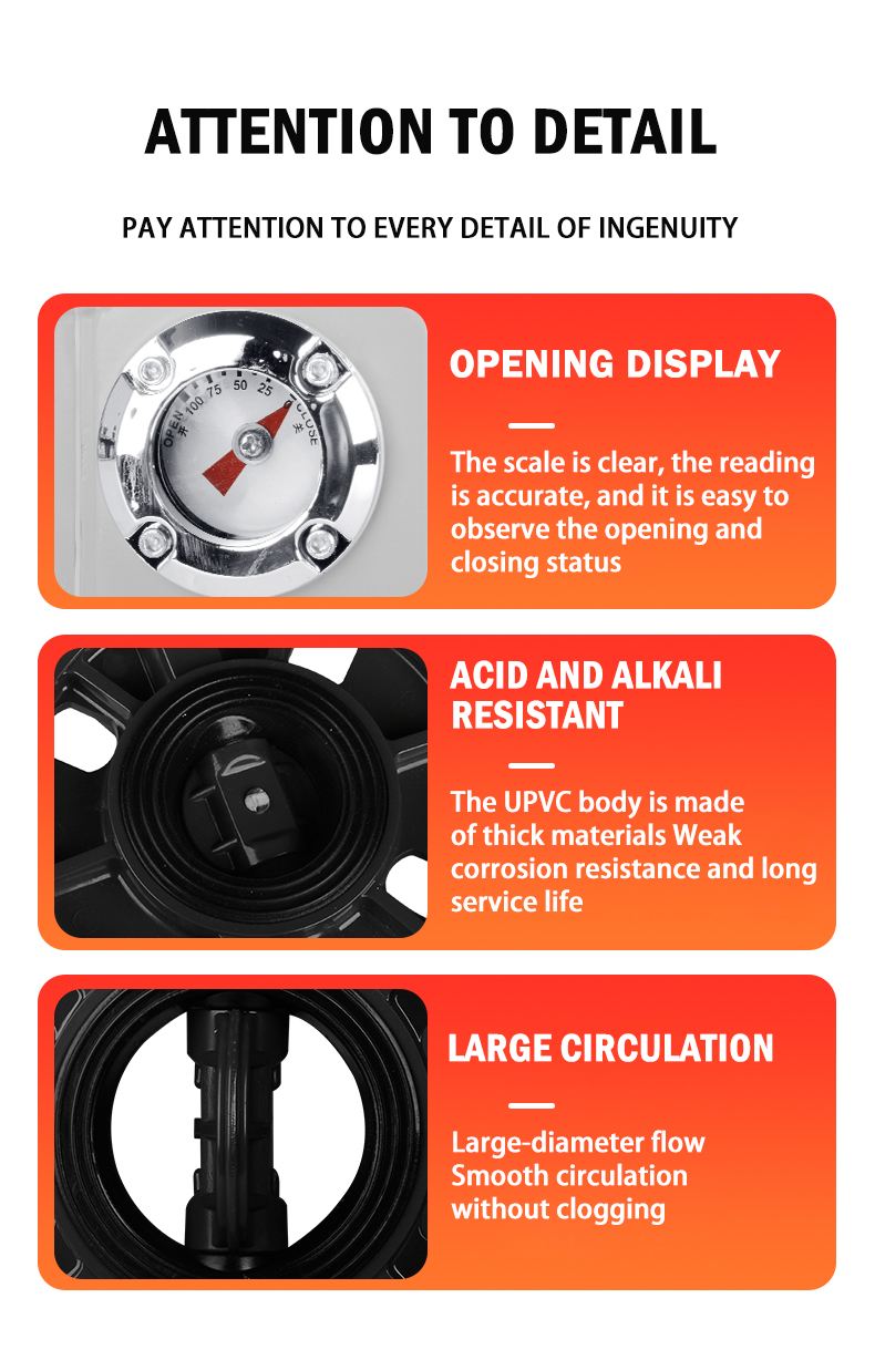 | Pressure-resistant | DN50~DN200 1.0Mpa/DN250~DN300 0.8Mpa | Disc material | UPVC/CPVC | |