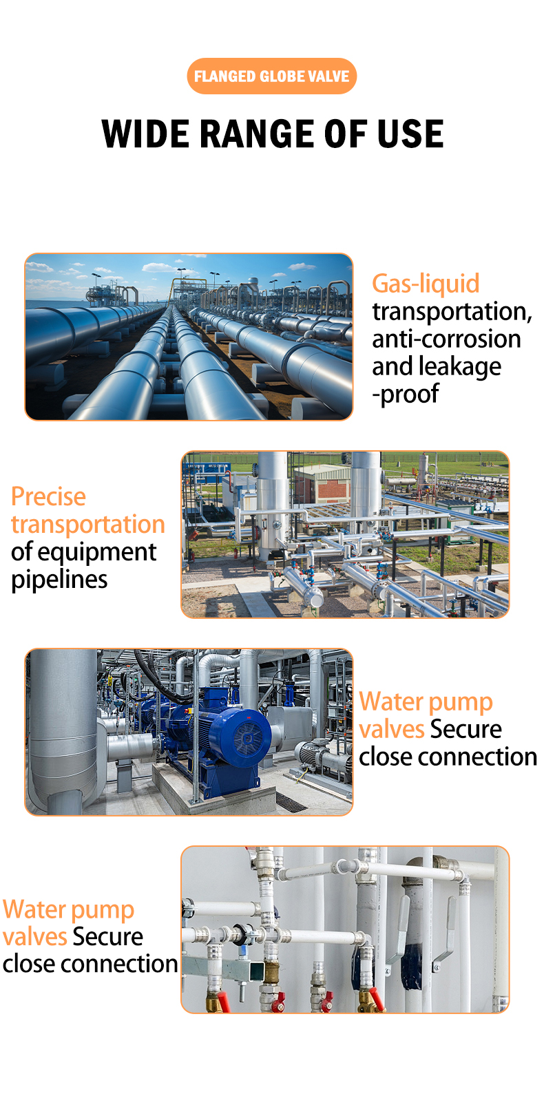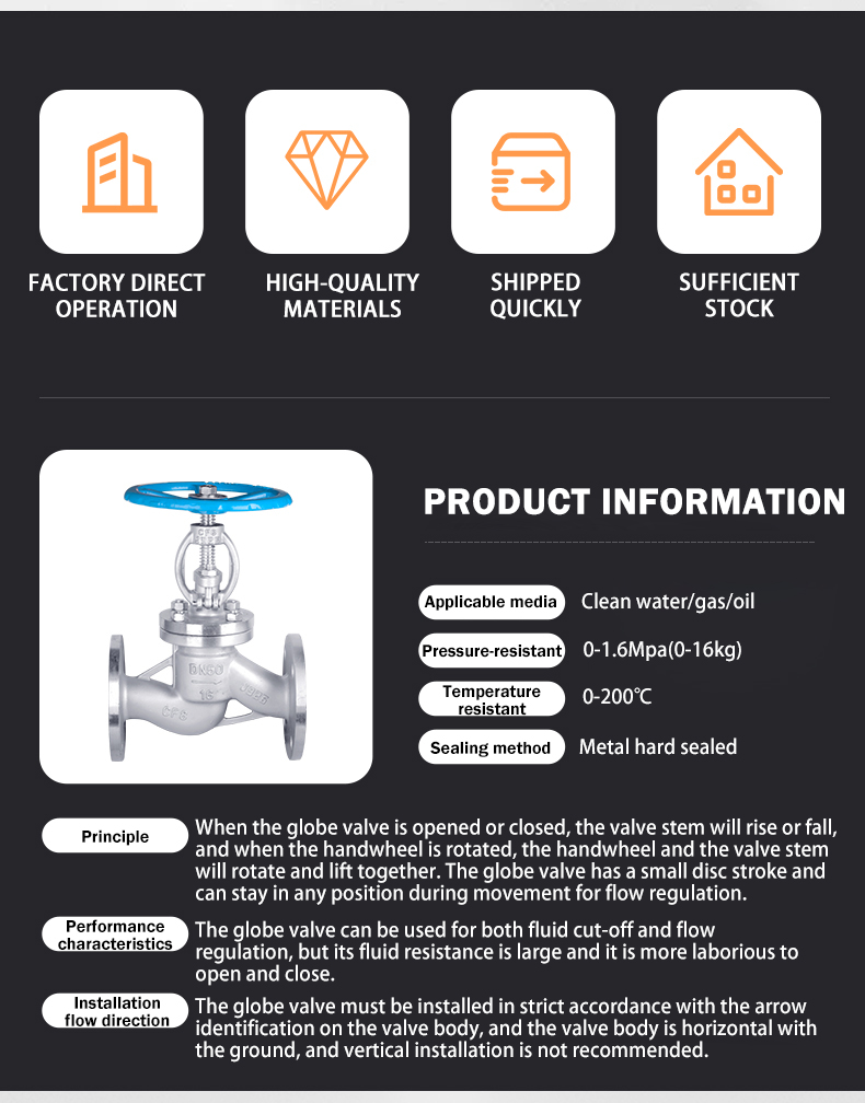 | Body material | 304 stainless steel flanged globe valve | Connection | Flange | Temperature of Media | Normal Temperature | ||||
