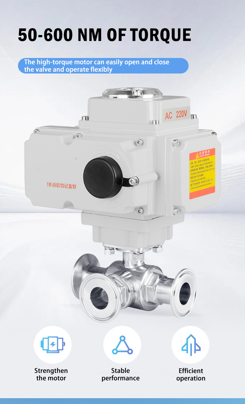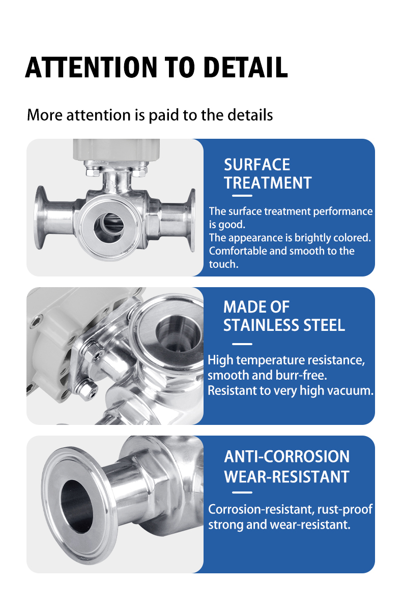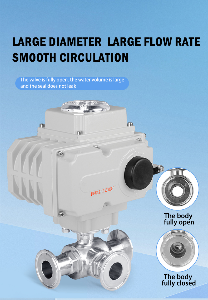 | Name | Sanitary stainless steel quick-install 3-way electric ball valve | Voltage | AC220V/DC24V | Protect level | IP53 | |